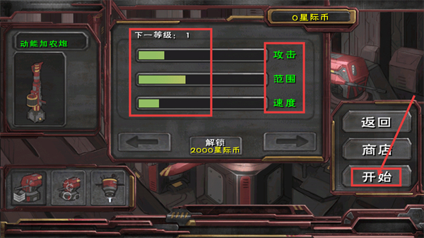1、先查看【动能加农炮】的【攻击】【范围】【速度】属性,解锁需【2000星际币】,确认后点击【开始】进入战斗关卡。
