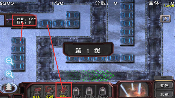 2、进入第1拨战斗,敌方单位是【血量:100-数量:5】,需在路径旁放置炮塔(如$50级炮塔),拦截敌方推进。