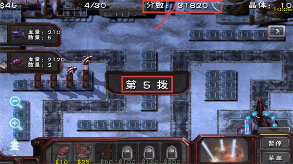4、击败敌方后会积累【分数:31820】,到第5拨时敌方强度提升,需升级现有炮塔,增强输出应对高血量单位。