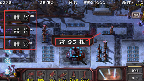 1、应对【第35拨】敌人,关注敌方【血量-12490】-数量-20等属性,利用【$276】-资金强化塔防,积累【5524000】-分数稳固防线。