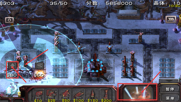 2、消耗【$80】升级防御塔,或用【$50】执行相关操作,借助技能效果提升输出,同时积累【5656000】-分数增强资源储备。