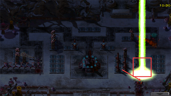 3、释放强力技能(如绿色光束)集中打击敌方集群,快速清理当前波次敌人,减少核心建筑受到的攻击压力。