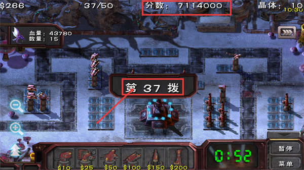 4、迎接【第37拨】敌人,留意敌方【血量-43780】-数量-15,利用【$266】-资金调整塔防,积累【7114000】-分数推进关卡。