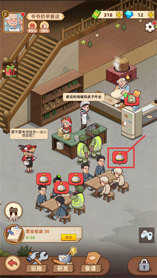 1、在【爷爷的早餐店】大厅,响应客人的上菜提示,同时推进【营业收益-30-9/30】任务,积累收益助力店铺运营。
