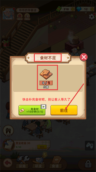 2、出现【食材不足】弹窗时,看到【红糖-0/1】短缺,点击【前往】按钮可跳转至食材采购界面补充物资。