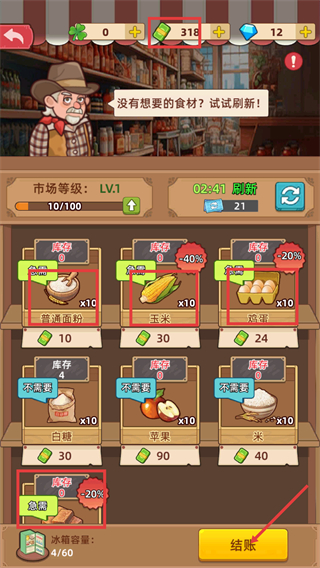 3、在市场界面,选择【普通面粉】【玉米】等急需食材,确认资源【318】充足后,点击【结账】完成采购。