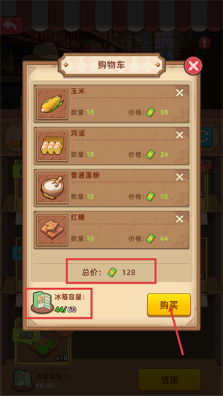 4、在购物车界面,确认食材清单后,查看【总价-128】与【冰箱容量-44/60】,点击【购买】完成食材采购流程。