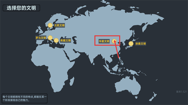 1、在文明选择界面,可选取【华夏文明】,不同文明有独特特点,选择后将进入对应文明的发展进程。