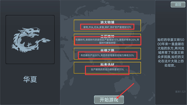 2、选择【华夏文明】后,其拥有【地大物博】【工匠精神】等增益效果,点击【开始游戏】即可进入该文明的发展玩法。
