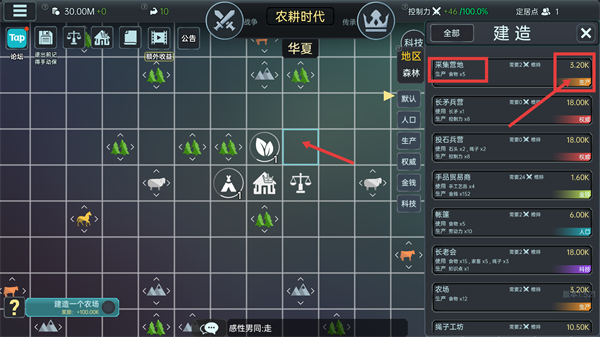 3、进入农耕时代后,在建造界面选择【采集营地】,消耗对应资源建造,可获取【食物-×5】的生产收益,推进资源积累。