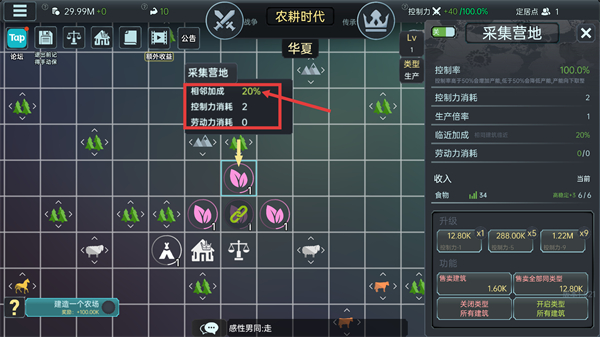 4、建造【采集营地】后,相邻同类建筑可触发【相邻加成-20%】,同时留意控制力与劳动力消耗,优化建筑布局提升收益。