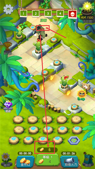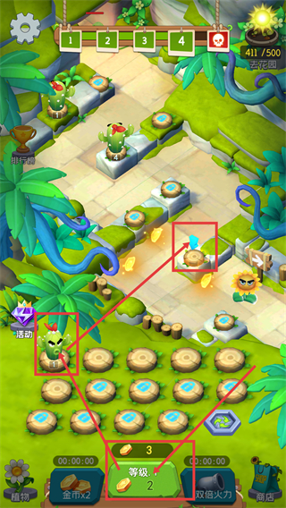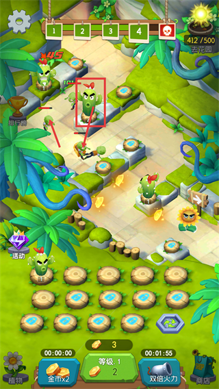 1、收集场景中的资源道具,提升角色【等级】,同时部署仙人掌类单位,利用其攻击能力应对敌人,积累金币推进进度。