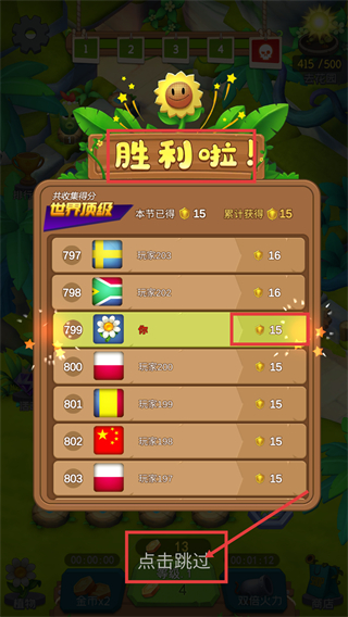 4、通关后会显示【胜利啦!】的结算界面,可查看本次得分与排行榜排名,点击【点击跳过】可快速进入下一轮游戏。