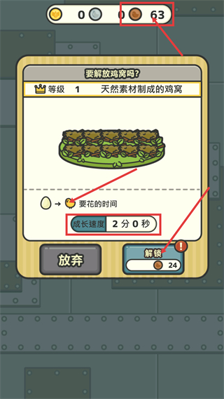 1、消耗【24】资源解锁【等级-1-天然素材制成的鸡窝】,其成长速度为【2分0秒】,可推进鸡蛋到小鸡的转化流程。