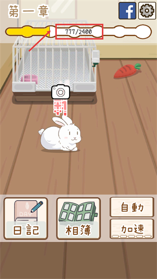 1、持续与宠物【兔兔】互动,章节进度会逐步累积,当前已推进至【777/2400】,互动后有进度提升反馈。