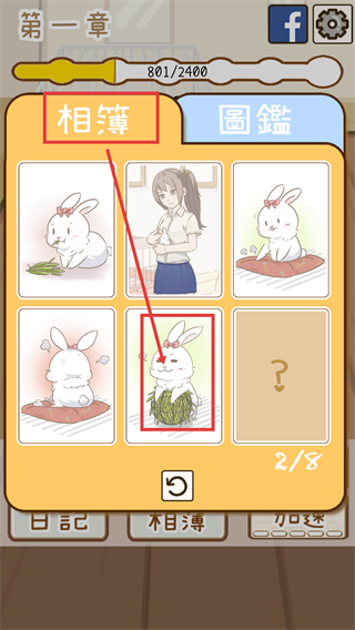 3、推进进度与解锁剧情后,【相簿】收集进度提升,当前已解锁至【2/8】的宠物相关图片。