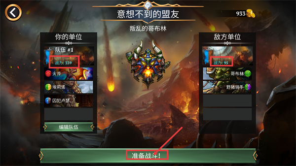 1、进入【意想不到的盟友】关卡,确认己方【队伍#1-战力:339】强于敌方【叛乱的哥布林-战力:95】,直接点击【准备战斗!】开启对战。