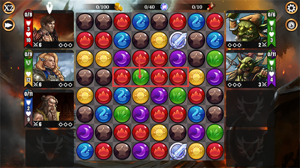 2、在消除界面中,优先将【绿色宝石】与周边【红色宝石】连接消除,能快速积累技能资源,提升己方角色对敌方的压制力。