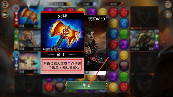 3、激活【火斧】技能时,须知其源自【1-熔岩巨龙巢穴】,点击【施法】可对首位敌人造成7点伤害,同时创造9颗红色宝石。