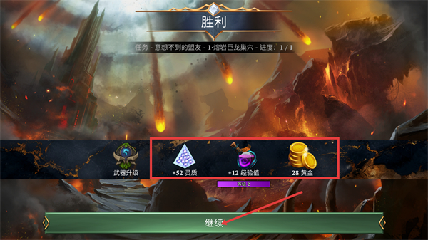 4、通关后获取【胜利】界面的奖励:【+52灵质】【+12经验值】【28黄金】,点击【继续】可推进后续任务流程。