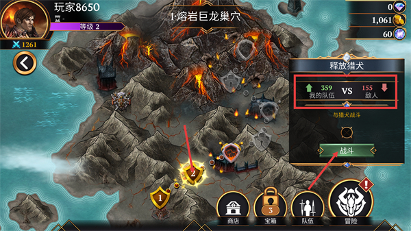 2、进入地图界面,查看【释放猎犬】模块中【559-我的队伍】VS【155-敌人】的战力优势后,点击【战斗】按钮推进该关卡挑战。