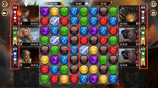 3、在消除界面中,优先连接【蓝色宝石】与【银色武器宝石】,这类组合消除能更快积累技能能量,提升对敌方单位的压制效率。