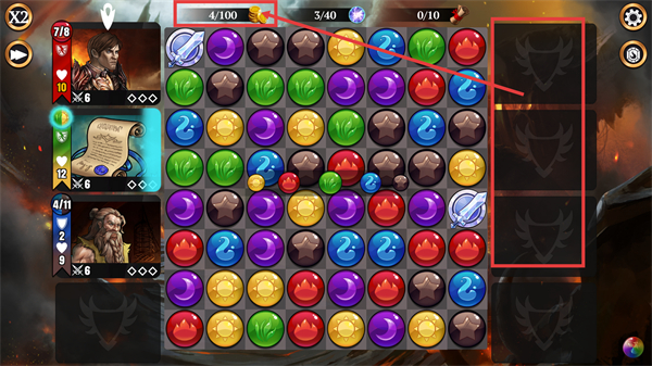 1、在消除界面里,优先连接相邻的多色宝石,同时留意顶部【4/100-金币】【3/40-蓝晶】的资源进度,高效积累资源以支撑后续技能释放。