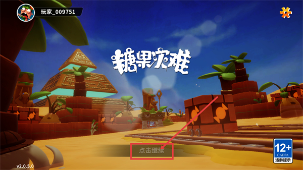1、进入【糖果灾难】的启动界面,确认【玩家_009751】标识后,点击【点击继续】,同时留意【12+-CADPA适龄提示】,推进至游戏关卡。