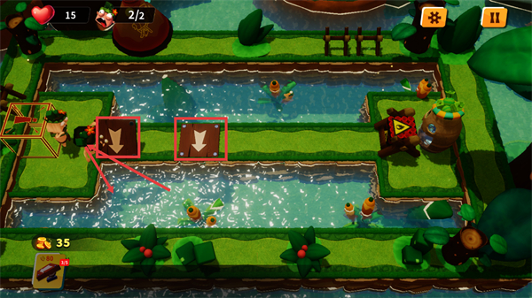 3、布置两个【向下箭头-方向板】以调整路径,注意当前【35-金币】的剩余数量,完成布置后推进关卡的后续环节。