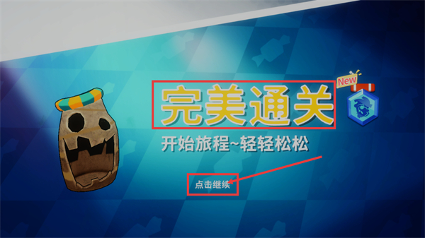 4、达成【完美通关】的目标后,查看界面提示,点击【点击继续】按钮,解锁新内容并推进后续的游戏旅程。