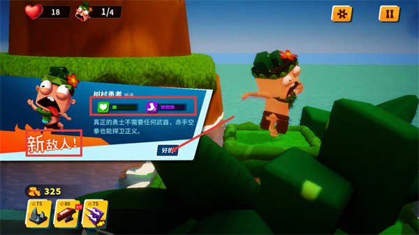 1、遇到【新敌人!-树村勇者】,查看其【生命值-能量条】信息后,点击【好的】按钮继续推进关卡,同时留意当前【325-金币】资源。