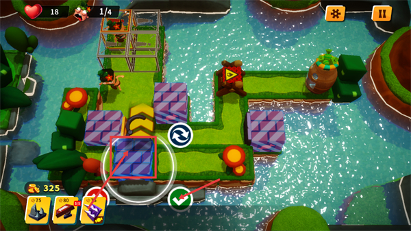 2、在关卡内将【紫色方块】布置到指定区域,确认布局后点击【绿色对勾】按钮,推进当前关卡流程,关注【325-金币】的消耗情况。