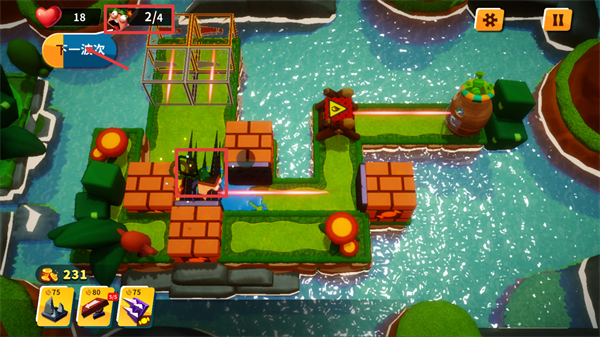 3、击败敌人后进度更新为【2/4】,点击【下一波次】准备应对后续敌人,同时留意当前【231-金币】的剩余数量以做资源规划。