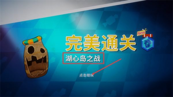 4、达成【完美通关-湖心岛之战】的目标后,查看界面提示,点击【点击继续】按钮,解锁新内容并推进后续的游戏旅程。