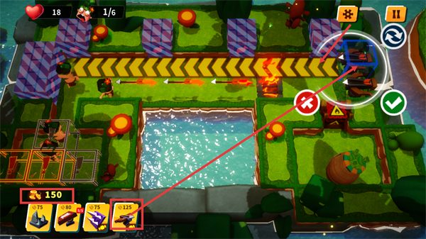 1、观察【18-爱心】与【1/6】资源状态,优先使用下方道具(如【150-金币】类)布置防御,阻挡火焰路径。