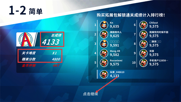 4、通关【1-2-简单】关卡后,关注【4133-总成绩】与【4800-糖果分数】,达标可解锁奖励以提升后续关卡战力。