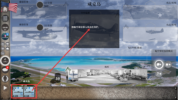 2、在【威克岛】场景中,将【CV-3】对应的航空单位移入攻击任务栏,完成部署以推进侦察与攻击流程。