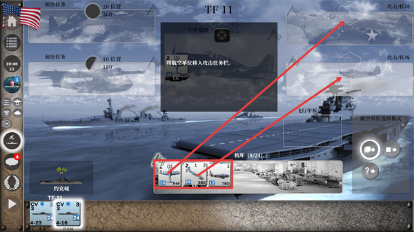 3、在【TF-11】编队界面,选取机库内的【F4F】【SBD】【TBD】单位,移入攻击任务栏以组建作战机群。