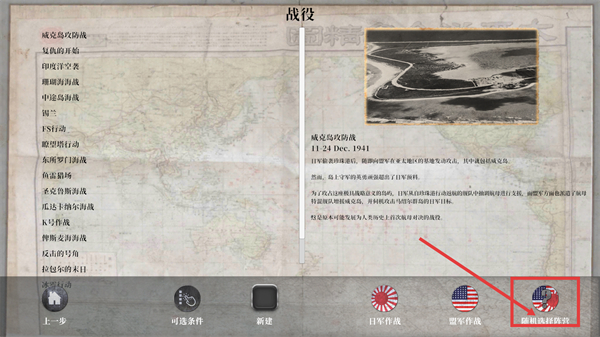 1、在战役选择界面,可选【威克岛攻防战】等战役,点击【随机选择阵营】可随机分配作战方以开启战役。