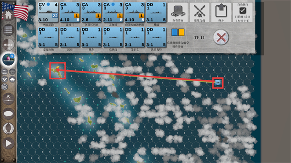 2、在【TF-11】编队界面,搭配【CV-4】【CA-3】等舰艇,启用【自动航行-目的地4344】功能规划编队行进路线。