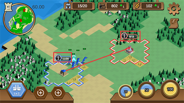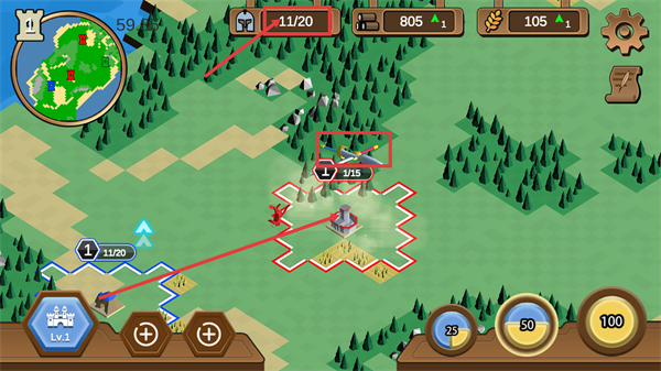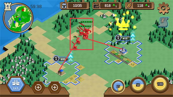 4、当己方红色单位集群沿红线推进至目标区域后,达成胜利条件会出现【皇冠】特效,此时可获取对应奖励,同时留意资源数值的增长情况。