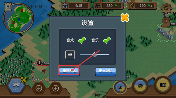 1、进入【设置】界面可调整【音效】【音乐】的开关,拖动【音量】滑块能调节响度,遇异常时可用【重新开始】功能重置当前进度。