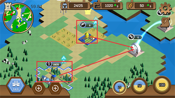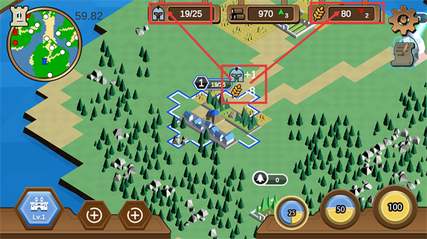 2、占领区域后会获得【+1】单位奖励,同时注意【19/25】单位上限与【80】资源的消耗变化,平衡资源与单位数量。