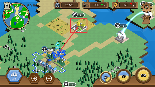 3、指挥【15/25】的己方单位集群,向目标建筑推进以占领区域,过程中关注【21/25】单位上限与资源的实时变动。