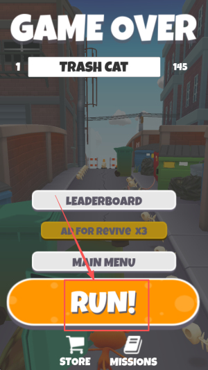 2、选择界面:在游戏主界面中,点击“Run!”按钮,进入跑酷准备界面,查看排行榜与商店。