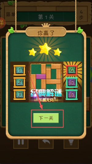 4、领取通关:成功完成后,系统显示“你赢了”,点击“下一关”按钮继续挑战。