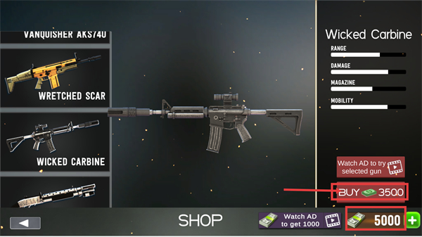 1、在【SHOP】界面,可选【VANQUISHER-AKS74U】等武器,选中【WICKED-CARBINE】后,消耗【3500】点击【BUY】购买装备。
