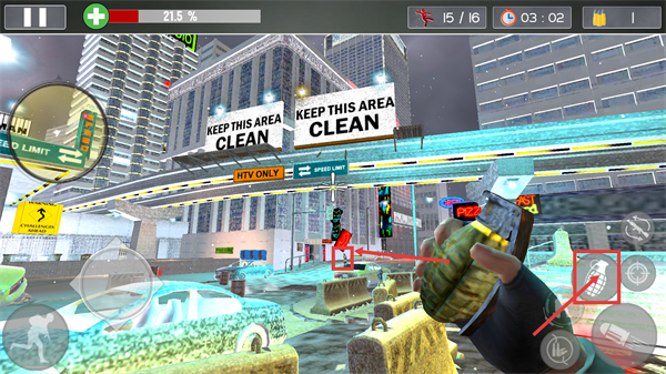 2、进入战斗场景,击杀进度【15/16】、剩余时间【03:02】、弹药【1/450】,利用【手榴弹】按钮攻击目标,推进关卡进度。
