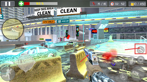 3、战斗中生命值降至【18.5%】,剩余时间【02:52】、弹药【10/450】,通过武器切换按钮更换枪械,继续消灭剩余目标。