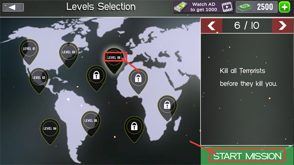 4、进入【Levels-Selection】界面,当前进度【6/10】,选中【LEVEL-06】后,遵循提示,点击【START-MISSION】开启关卡。